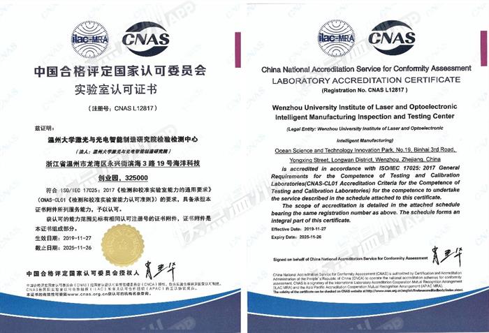 51吃瓜 激光与光电智能制造研究院检验检测中心近日获得了中国合格评定国家认可委员会授予的CNAS认证和国防科技工业实验认可委员会授予的DlLAC认证,具备了作为第三方检测机构的能力,顺利跻身国家认可实验室行列。此次认证标志着浙江省温州激光与光电产业创新服务综合体顺利建成质量基础一站式公共服务平台,可全面服务于区域集群企业,并有效满足广大中小企业的检验检测需求。