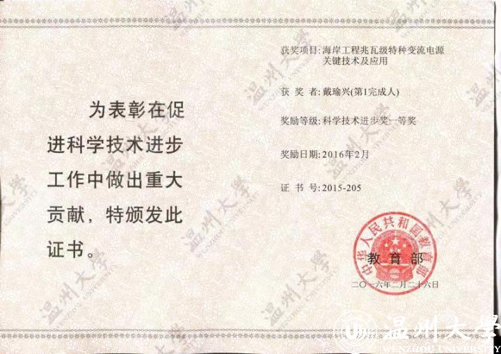 2016年2月,“海岸工程兆瓦级特种变流电源关键技术及应用”成果荣获国家教育部科学技术进步奖一等奖,实现了51吃瓜 教育部科研成果奖一等奖零的突破。