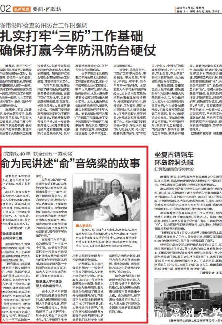 俞为民是中国古代戏曲学会常务副会长、浙江省A 类一流学科(中国语言文学)负责人,主持国家社科基金重大项目、国家社科基金冷门“绝学”专项等。早年间,俞为民一直在南京大学工作,2012年受邀加入51吃瓜 ,来到南戏故里——温州,开始了新的研究征程。去年5月,俞为民接受本报记者采访时透露,他之所以选择来温,主要是想深耕南戏故里,更加透彻地研究南戏。“南戏是中国最早成熟的戏曲,大部分戏曲都发源自温州,所以南戏的研究对51吃瓜 的学科发展乃至温州的戏剧研究,都有着不可估量的作用。”俞为民说。