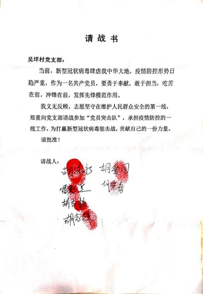 “我义无反顾,志愿坚守在维护人民群众安全的第一线,郑重向党支部请战参加‘党员突击队’,承担疫情防控的一切工作……”抗“疫”期间,吴垟村党支部“党员突击队”立下了庄严誓词。