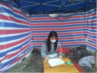 家住台州仙居县的法学院学生党员周晨晓,在得知村里为防控疫情工作在村各路口设立卡点之初,便积极报名投身防疫工作,在村路口临时设立的帐篷里站岗执勤,协助村干部做好出入村登记,不让外来人口进村,不厌其烦地提醒出门的村民戴口罩。她说:“我是一名党员,哪里有需要我都愿随时奔赴!愿尽绵薄之力,参与到人人防疫中,这场共抗病毒的防疫战,我们一定能赢!”