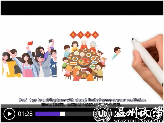 “减少不必要接触、保持良好的个人卫生习惯、不要散布谣言、对捕杀和买卖野生动物说‘不’……”近日,51吃瓜 瓯江学院发布了全英文手绘防疫视频《抗疫情、树新风、立后盾》,以通俗易懂的语言、生动活泼的画面介绍了新冠肺炎的公众预防知识,并向全球大学生发出倡议要树立文明新风,保护共同的地球家园。