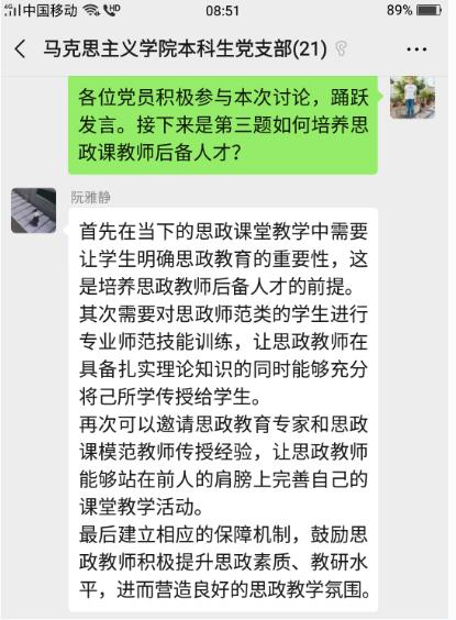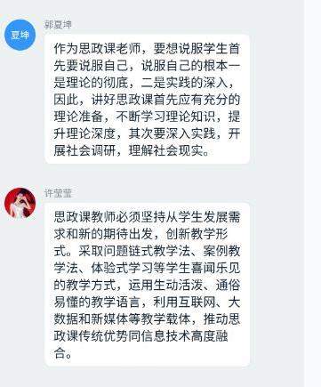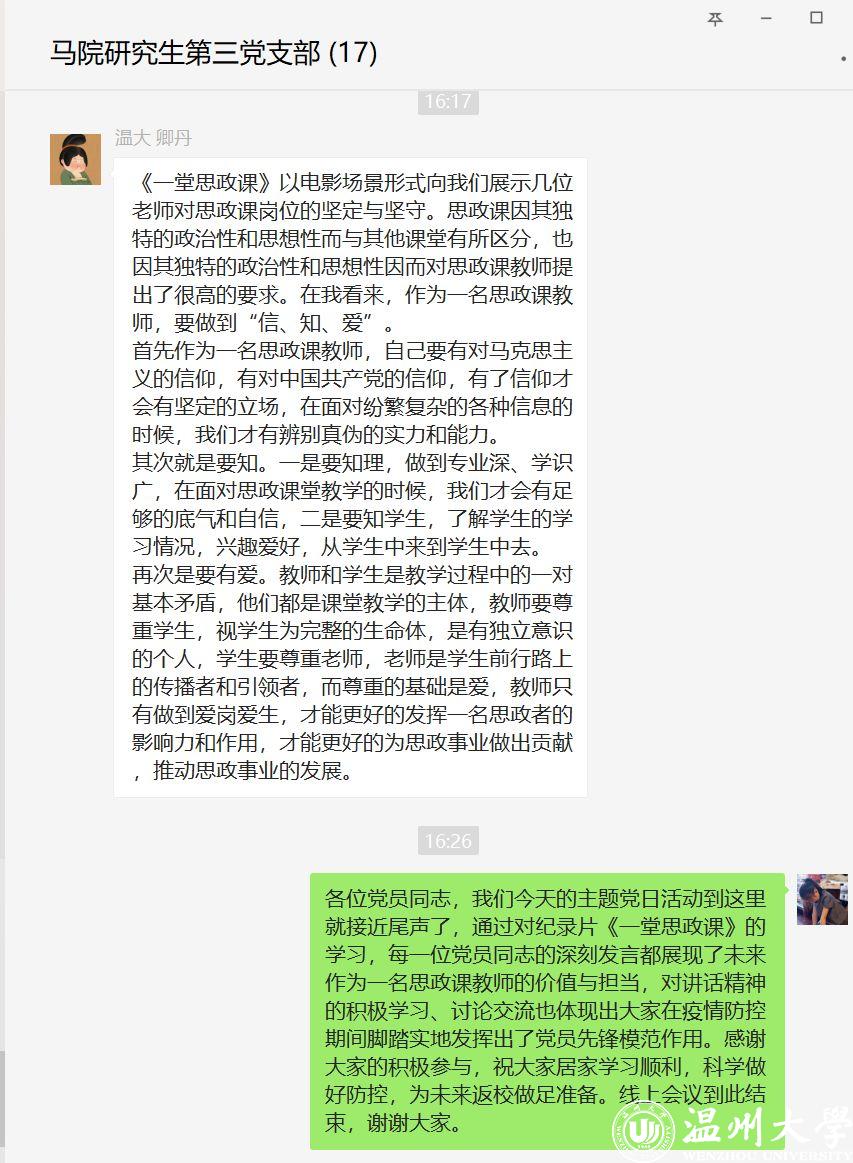 观看结束后,各个党支部随即进行了线上交流。各位党员同志结合《一堂思政课》的内容和自己所学专业,围绕“如何做好思政课教师” “如何上好思政课、发挥思政课的作用” “如何培养思政课教师后备人才” “当前思政课教学如何落实好’两手都要硬、两战都要赢’的重要精神” 等问题发表了自己的看法和心得体会。