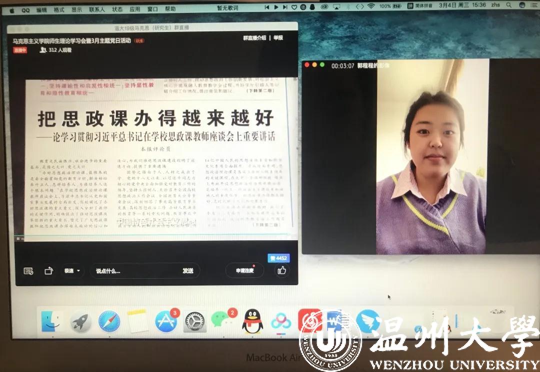 同时,为贯彻落实习近平总书记在学校思想政治理论课教师座谈会上的重要讲话,增强思想政治理论课的思想性、理论性、针对性和亲和力,并结合学校组织部统一部署,学院在3月4日下午以“不见面”形式集中开展理论学习会暨“抗疫情、促发展、当先锋”支部主题党日活动,集体观影《一堂思政课》,深入开展新时代思政课改革创新大讨论活动。