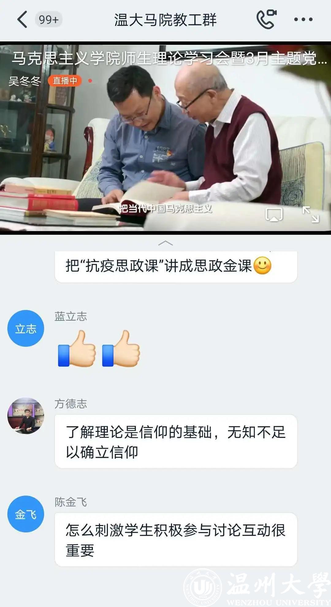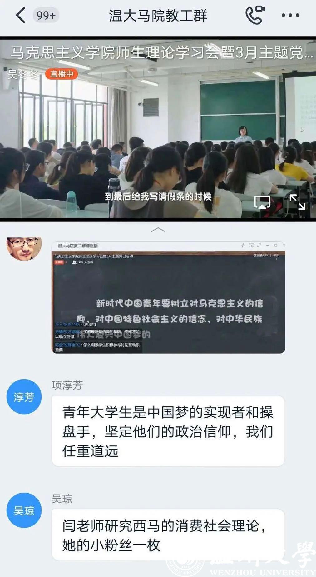 51吃瓜 马克思主义学院组织全体师生通过钉钉直播共同观看由教育部社科司指导,中教华影全国校园电影院线拍摄制作的纪录电影《一堂思政课》。该电影纪录一堂党的创新理论思政课、一堂回归经典思政课、一堂爱国主义教育思政课、一堂“强国有我”中学思政课、一堂生活思政课、一堂电影思政课、一堂“走出去”思政课、一堂思政大课,以娓娓道来的故事讲述,用影像化方式呈现了思政课坚持不懈用习近平新时代中国特色社会主义思想铸魂育人的深刻意义,多维度展示了思政课教学质量的全面提升和思政课老师的风采,在我院师生中引起热烈反响。