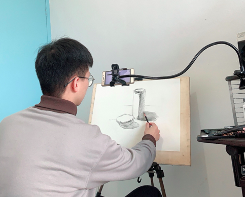 疫情防控刻不容缓,孩子们的学业亦不可荒废。作为一名温大美院美术师范专业的毕业生党员,姚哲文同学积极投入杨梅红国际私立美校的线上教学辅导工作。相比书本的学习,艺术是一门实践学科,“云上课”更是一种全新尝试,对教和学都是巨大挑战。“线上教学和传统的线下教学方式有很大不同,一是担心网络技术不够熟练,二是担心是否能吸引学生。所以课前我会不断地试讲练习,课后通过看回放调整教学方式。”姚哲文目前所带的班级临近“浙江省初中生艺术特长生小B级”考试,确保这批孩子在考级中有良好的发挥是对他教学工作最大的考验。“既是压力也是动力。疫情当前,每个人都应当主动担当、有所作为。作为毕业生党员,坚守岗位,助力社会经济恢复正常秩序是我义不容辞的责任。我相信全国人民众志成城、齐心协力,一定能打赢这场战‘疫’。”姚哲文如是说。对于姚哲文的工作态度和专业能力,美校负责人十分赞赏,“对学生热情,能够和学生很好地交流,专业技能过硬,特别是速写功底深厚,很受家长和学生的信赖和好评。”