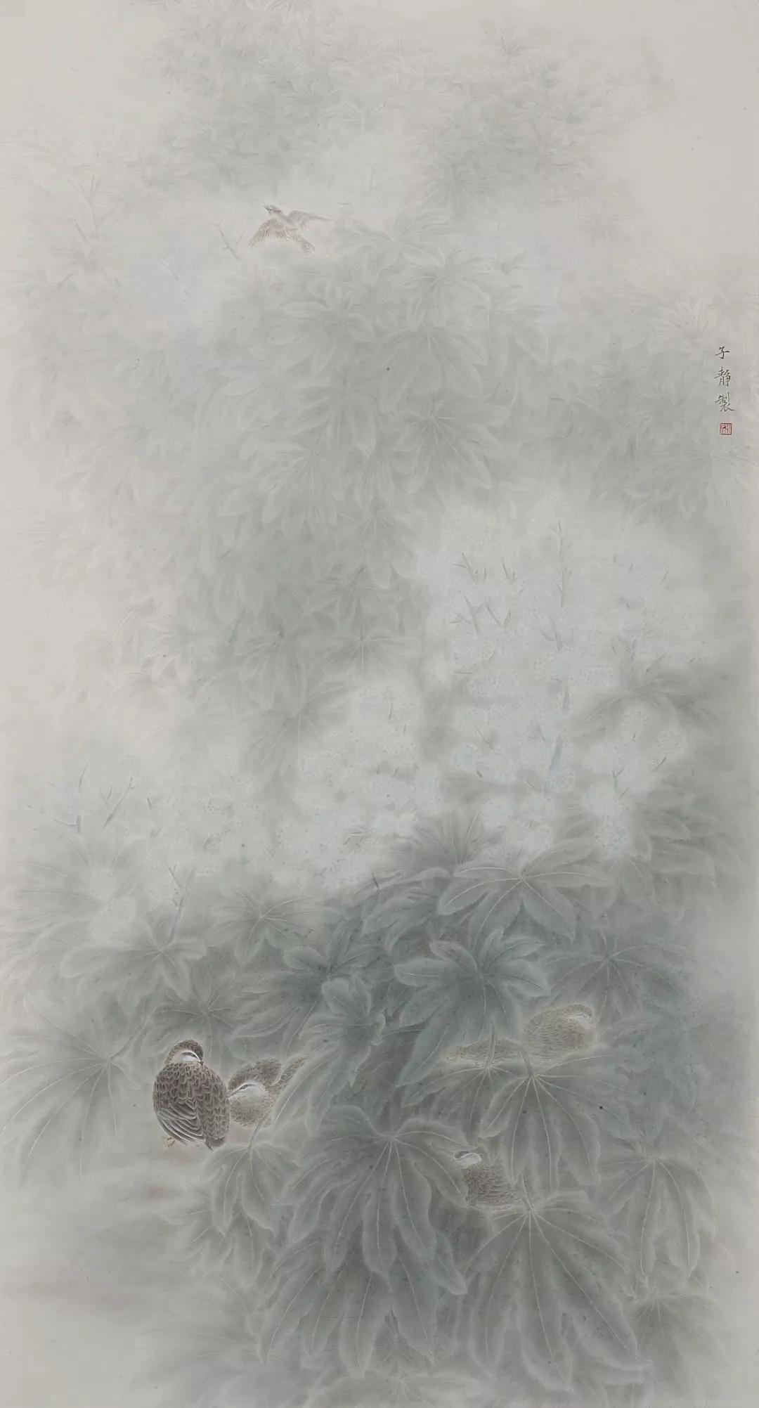 谢子静专攻中国花鸟画,对大自然的一花一鸟,一草一石均投以极大的热情与兴趣。她时时被这些物件的优美情态所感染,情急之下便命笔记写,反复品味,不断揣摩,并联想前人的艺术表现,使这些生动可爱的对象,升华为初步的艺术形象存记于脑海之中,这为她的艺术创作提供了丰富的自然原始素材。平时,除了虚心跟随名家学习外,还十分重视研习前人的传统艺术表现方法,尤其是宋人的花鸟画,使她产生了浓厚的兴趣。在临摹经典作品时,不仅力求神貌皆合,并把精力集中在探讨其原因、寻找其规律、挖掘其奥妙之上。从取材、构图、创意、表达等多方位加以硏究,常常以一个探宝者的心境去逐一玩味,直到有所领悟。这种科学而严谨的治学态度,奠定了创作的坚实基础。