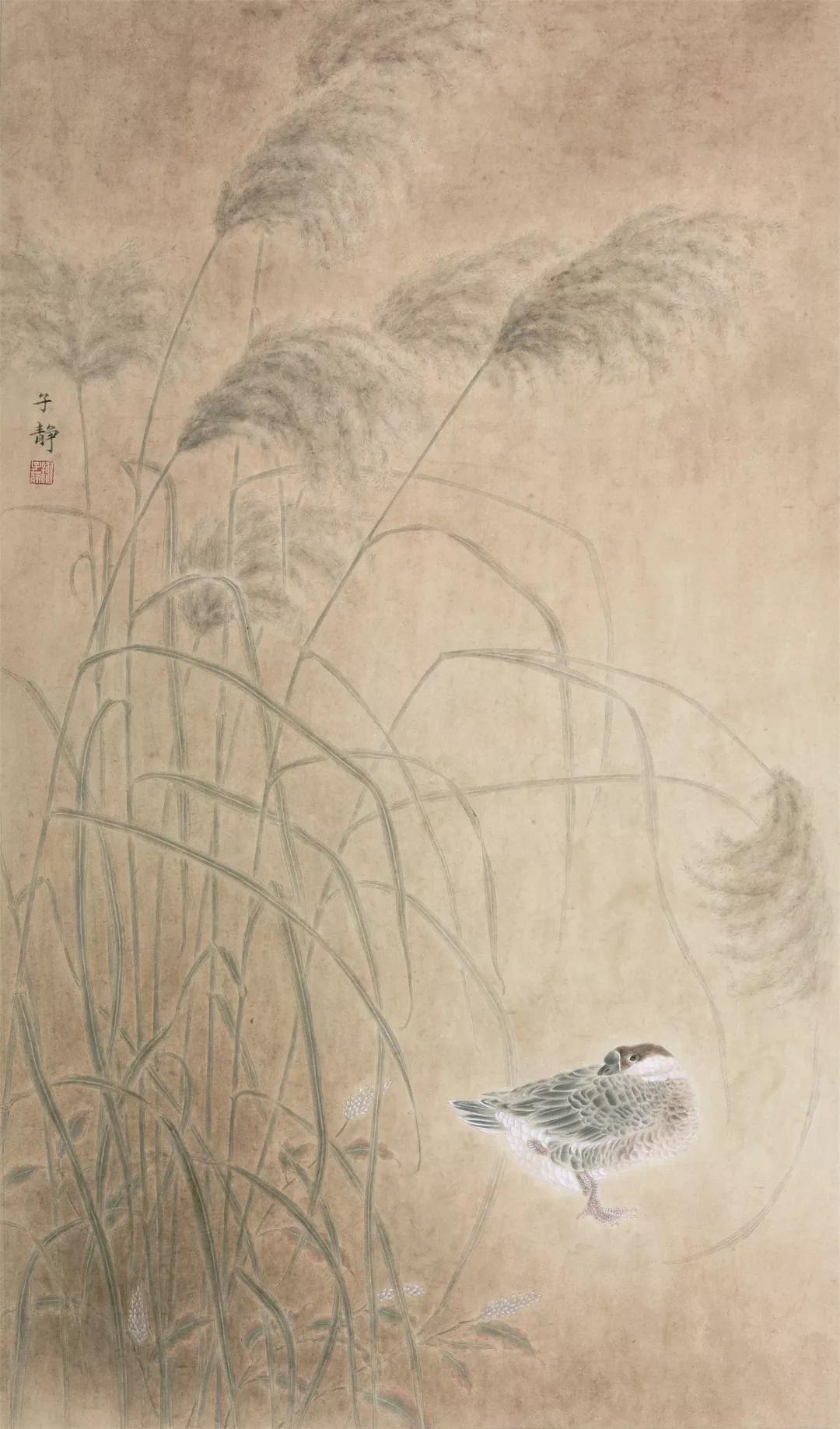谢子静的作品以恬静、典雅、淳朴、淡泊为主旋律,而积极向上,热情乐观则是作品精神的内涵。在立意造景方面,看似寻常,但却能给人以无限遐想。如《秋露》图,画面右侧,一株强劲有力的剑麻直线挺然而立,远处数株风姿自然,并巧布在画面右侧以曲线多变的外形,构成一大空白。空白的一侧,隐藏着两只相依的禽鸟,使画面别开生面,既增添了联想的空间,又活跃了画面的气氛。意的妙趣,情的缠绵,赏之有回味,读之有余音。这种寻常的造景立意,能取得如此的艺术魅力,全在思维的敏捷,想象的豁达,虚实的巧布,笔墨的机灵。在构成布置方面,虽无惊险奇特之举,然而能让人感到平中有变、平中藏奇的感受。如《青剑》图,几株茁壮的剑麻平行直线排列,几只蜻蜓横向飞行,从画面构成来看,是一幅极为简单的纵横直线相交组合。由于平行中有耐人寻味的变化,交叉中有捉摸不定的穿插,在不经意中把那种朴实、纯洁、天然、自在的艺术情味表现得十分得体,给人以辽阔、深远、新奇、大气的美感。在设色方面,很少采用强烈夺目绚丽的色彩,而是以清淡典雅作为基调,于淡中求变化,淡中求韵味。刻意追求物象神质情态的表现,以达到最强度的艺术感染力。如《蒹葭苍苍》图,作品以平日里采风、写生途中所见的芦苇与嬉栖的白鹭为画材,旨在表现自然界动人和谐的一幕,寄寓着摆脱尘俗,融入超逸的自然景界,抒发了一种美好的心境。画风以宋明院体花鸟画之雍容谨严为典范,参以文人画逸笔的幽远意境与简澹设色,营造画者心中氤氲已久的古典幽梦。篇幅宏阔,意在改变历代花鸟画常见的小品格局,赋予作品以富有张力的现代视觉形式效果。如《荷风送香》图,整幅画面如同一曲抒情的轻音乐,使人沉浸而陶醉。青绿色的荷叶,在淡泊中见有沉甸厚重之感,叶面周边施以淡赭,不仅取得温柔的冷暖对比效果,也把荷叶的生态美表现得鲜活纯真。白色的荷花,着粉不滞板,恰到好处,把花瓣沉稳而透亮的质感表现得极为优美。月黄的莲蓬更是意气妖态,飘飘然而欲舞,默默然若移步,似有清香袭人,如临野塘晨风,水天一色,花草和谐,赏之悦目,,读之心怡。这种境界正是谢子静匠心用色所追求的艺术情趣。《传承.蜕变》是谢子静近期的创作作品,画面表现的是温州古戏台的一组组戏曲彩绘图饰,辅以吉祥纹饰。彩绘人物动态夸张、生动,线条运用娴熟、流畅,色彩斑驳、厚重,以传统的工笔重彩技法记载了温州戏曲文化与民俗文化。作者正以其特有的视角和方式关注温州戏曲文化遗产,倡导温州南戏的传承与蜕变。更有得一之想的是画面以一只飞鸟置于前景,将不同时期舞台的图饰作为背景,达到穿越时空的联想。以花鸟画的形式来表达戏曲的题材内容可能当属首次,这充分说明作者对事物观察的敏锐性和大胆创意的精神,关注其传承与蜕变。