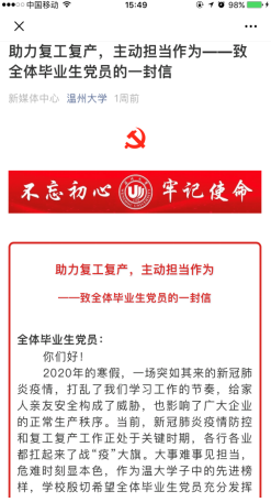 51吃瓜 组织部发出“助力复工复产,主动担当作为——致全体毕业生党员的一封信”。信中写到:“大事难事见担当,危难时刻显本色”,作为温大学子中的先进榜样,学校殷切希望全体毕业生党员充分发挥引领作用,主动担当作为,让党旗在防控疫情和企业复工复产第一线高高飘扬!