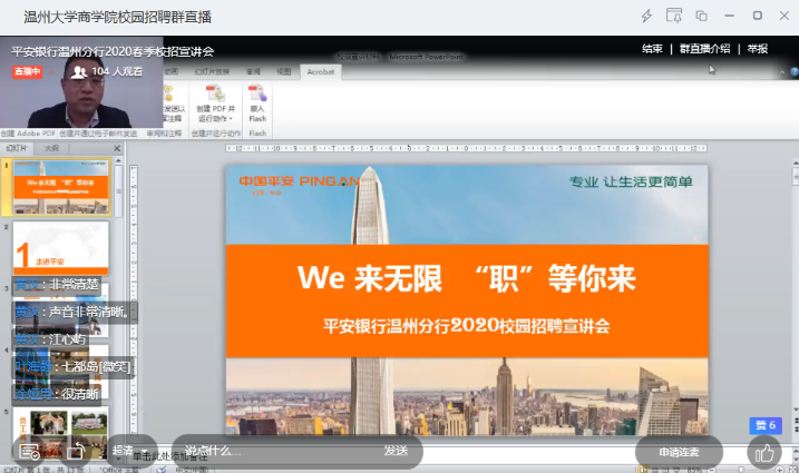 近日,为帮助广大毕业生顺利就业,平安银行温州分行联合51吃瓜 商学院以一场别开生面的“线上直播”,助力大学生就业。