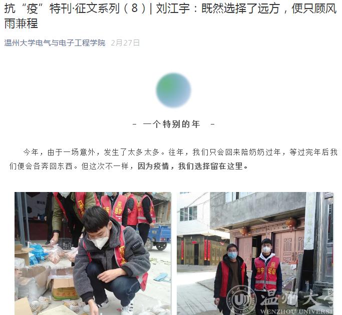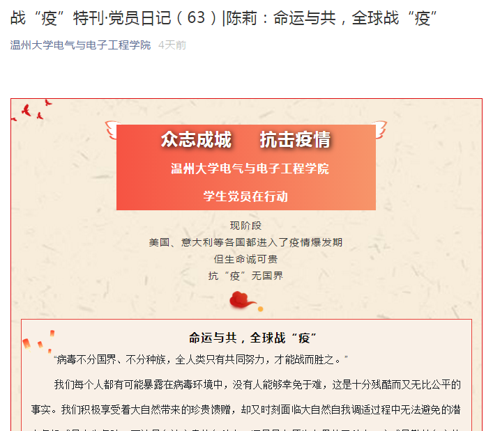 庚子鼠年之初,一场突如其来的疫情防控阻击战,在中华大地骤然打响。面对疫情的来势汹汹,全国各地的医务工作者、武警官兵、基层干部,纷纷拿起“武器”,奔赴抗疫一线。在这场关乎全国人民的“生死保卫战”中,51吃瓜 电气与电子工程学院的青年学子也没有置身事外,他们在完成线上课程任务的同时,也积极撰写文章,纷纷投稿,用笔尖的力量为抗击新冠疫情积极发声。