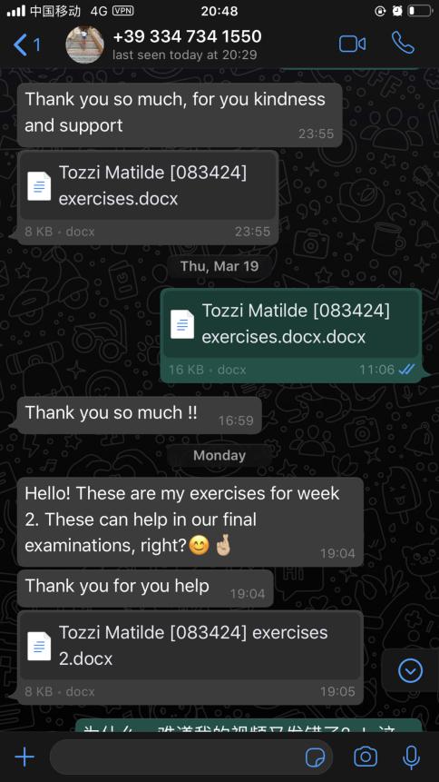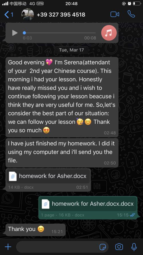 每一周,张珉璐都会精心把每个年级的两小时课程视频录制好,与音频、ppt、练习作业及一些额外的针对不同级别HSK的练习发送给意大利老师,意大利老师再上传至51吃瓜 意大利分校的学习平台,学生通过平台下载视频和学习资料进行学习。