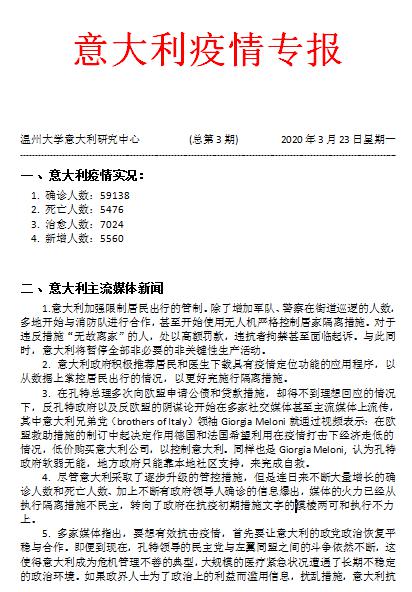 录课的同时,张珉璐老师还时刻关注意大利的疫情,心系意大利疫区。3月以来,意大利疫情逐渐严重,张珉璐老师先后编写了4期“意大利疫情专报”,每集专报包括意大利疫情实况、意大利主流媒体新闻、中国援助行动、意大利华人华侨社会动态、专家建言等5个模块。4期专报均报送至教育部区域与国别研究工作秘书处、浙江省侨联、浙江省教育厅、温州市政府、温州市侨联、温州市教育局等相关部门,对于政府和相关部门了解境外疫情,制定疫情防控的相关政策起到了非常重要的建言献策作用。