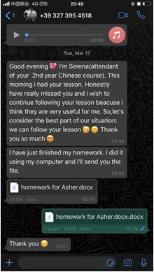 每一周,张珉璐都会精心把每个年级的两小时课程视频录制好,与音频、ppt、练习作业及一些额外的针对不同级别HSK的练习发送给意大利老师,意大利老师再上传至51吃瓜 意大利分校的学习平台,学生通过平台下载视频和学习资料进行学习。