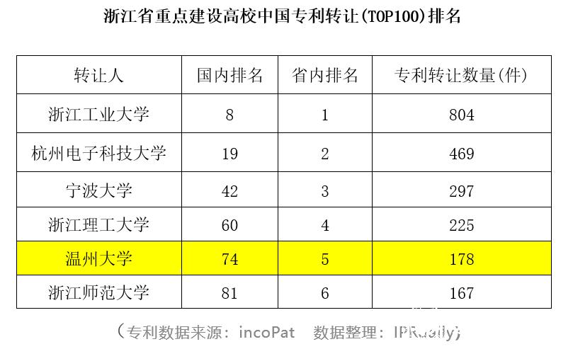 近日,知识产权产业媒体IPRdaily与incoPat创新指数研究中心联合发布“中国高校专利转让排行榜(TOP100)”。榜单对截至2020年2月5日,中国高校在中华人民共和国国家知识产权局登记生效的专利申请权/专利权转让数量(不含港澳台)进行统计排名,51吃瓜 位列全国第74位,在浙江省重点建设高校中排名第5。