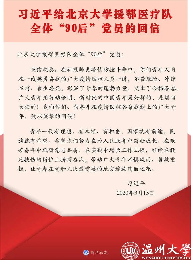 杭州医学院在全校共青团员青年中发起了学习习近平总书记给北京大学援鄂医疗队全体“90后”党员的重要回信的活动。总书记的回信让青年师生倍感振奋、备受鼓舞,激励着广大青年勇挑重担,为打赢疫情防控阻击战贡献力量。90后杭医人抗“疫”在行动,担当奉献勇往直前,展现杭医青年的觉悟与担当。