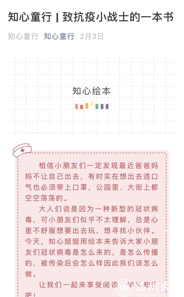 在防疫抗战的第一时间,知心姐姐团队牢记初衷,坚持使命,在团队多名志愿者成员的共同努力下,通过介绍新冠病毒的来源、传播途径、传播方式、易感人群、预防措施等,录制了新冠防疫视频,自制原创儿童防疫绘本、抗击疫情童话故事,并在知心公众号上推出了线上绘本阅读系列课程,温州龙湾图书馆、医睦之家等平台多次推出知心绘本,获得了广泛好评。