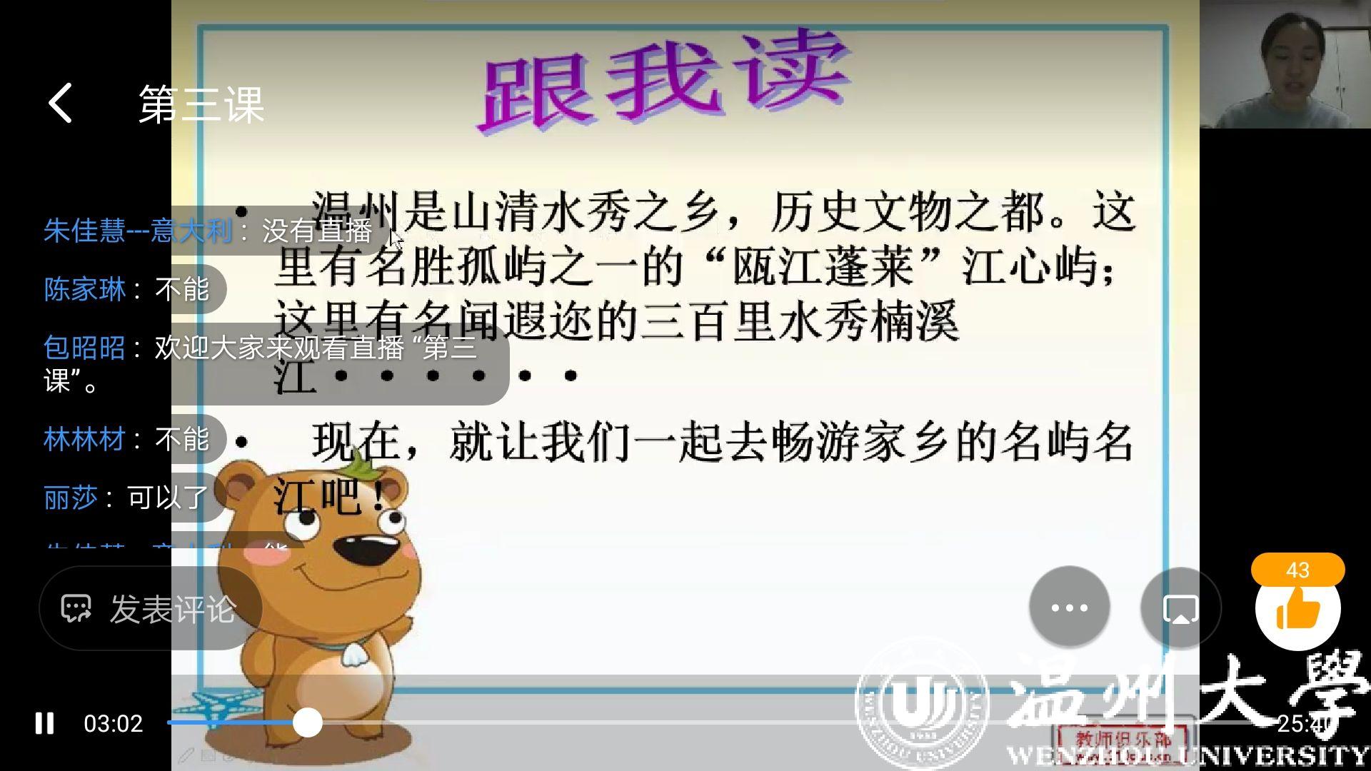 这故乡的味道,第一香,是风景。伴随着温州话版“温州欢迎你”动听的歌声,美丽温州的画面缓缓呈现在孩子们的面前。通过云端网课的方式,孩子们好像在经历一场奇妙的飞行之旅,感受到了楠溪江、雁荡山大气豪迈,也体会到了南麂岛的小巧精致。网络,让孩子们即使身处异国他乡,也能将温州的青山绿水,温州的大街小巷尽收眼底。
