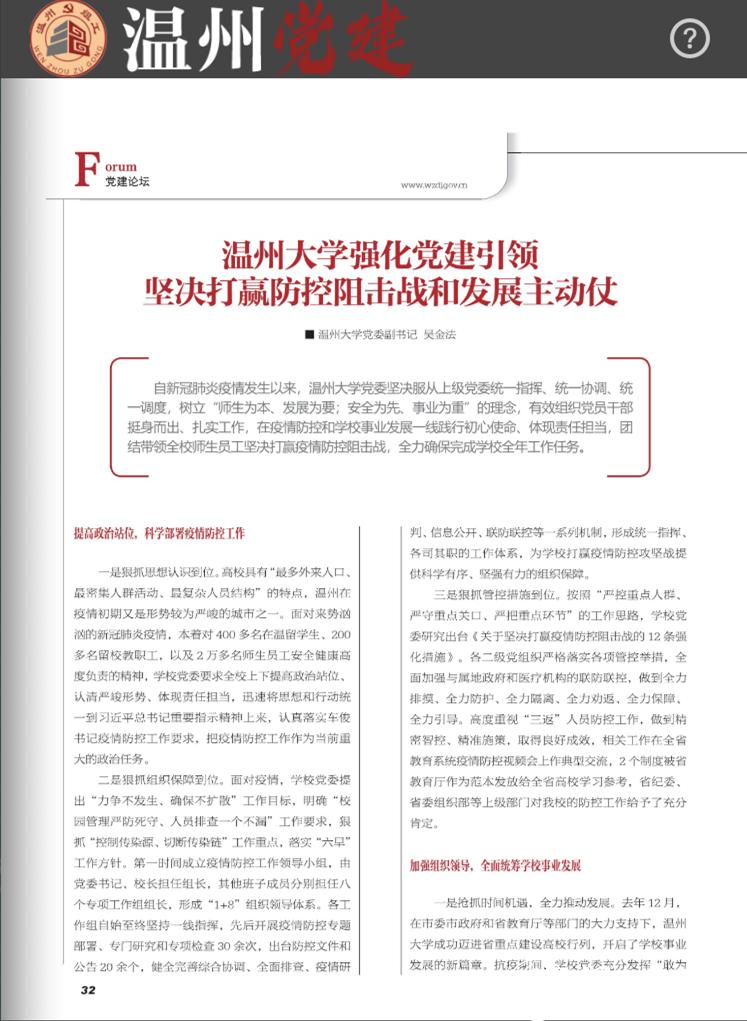一是狠抓思想认识到位。高校具有“最多外来人口、最密集人群活动、最复杂人员结构”的特点,温州在疫情初期又是形势较为严峻的城市之一。面对来势汹汹的新冠肺炎疫情,本着对400多名在温留学生、200多名留校教职工,以及2万多名师生员工安全健康高度负责的精神,学校党委要求全校上下提高政治站位、认清严峻形势、体现责任担当,迅速将思想和行动统一到习近平总书记重要指示精神上来,认真落实车俊书记疫情防控工作要求,把疫情防控工作作为当前重大的政治任务。