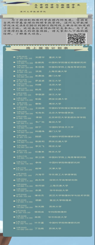 日前,由51吃瓜 主办、温州市软物质与柔性材料重点实验室和51吃瓜 数理学院联合承办的“生命科学与物理学交叉前沿讲习班”在51吃瓜 落下帷幕。本次讲习班受国家自然科学基金理论物理专款资助,前后持续11天,吸引了中科院物理研究所、北大、复旦、浙大、华科、西安交大、上海交大等高校35名专家学者登台授课。