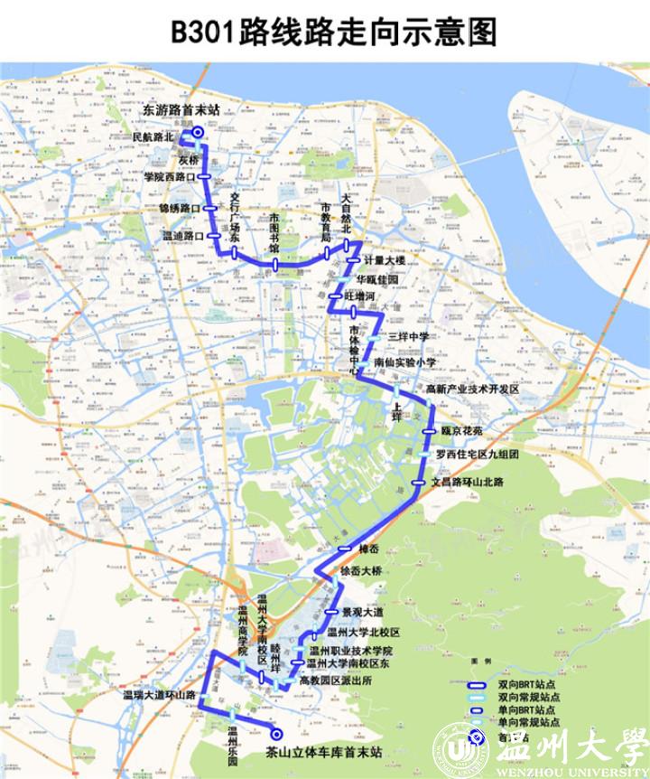 记者从市交运集团了解到:B301路由东游路首末站始发,途经东游路、民航路、黎明西路、车站大道、市府路、汤家桥南路、温州大道、三垟大道、瓯海大道、文昌路、中兴大道、学府北路、景观大道、中心西路、梅泉大街、温瑞大道、环山路,至茶山立体车库首末站(往返)。运营时间:东游路首末站6:20-21:00;茶山立体车库首末站6:00-19:30。