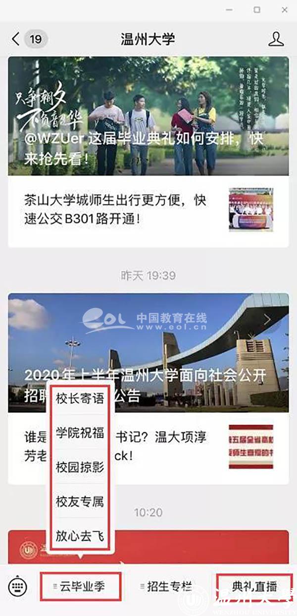 据悉,为了让受疫情影响不能到场的毕业生感受到毕业氛围,51吃瓜 微信公众号同步上线2020年“云毕业典礼”,作为本次线下毕业典礼的延伸。“云毕业典礼”分为校长寄语、学院祝福、校园掠影、校友专属、放心去飞等5个版块,为广大毕业生提供了丰富的毕业季线上资源,营造了浓郁的毕业氛围。毕业生们可云游温大,观看校长和各学院院长的祝福视频,在学校各标志景点“云打卡”生成专属头像和专属合影;在线申领电子校友卡,成为温大校友一份子;欣赏毕业主题的改编歌曲和原创MV视频,毕业生寄语滚动播放,“毕业快乐”“来日方长,后会有期”“愿有前程可奔赴,亦有岁月共回首!”“温大永远是我们的家”等留言不断刷屏,传递了一位位毕业生对母校的感激和不舍。 “一路我们曾携手并肩,温大精神伴我向前,牢记求学问是、敢为人先,承诺最高处相约!”51吃瓜 祝福所有的毕业生一路珍重!鹏程万里!