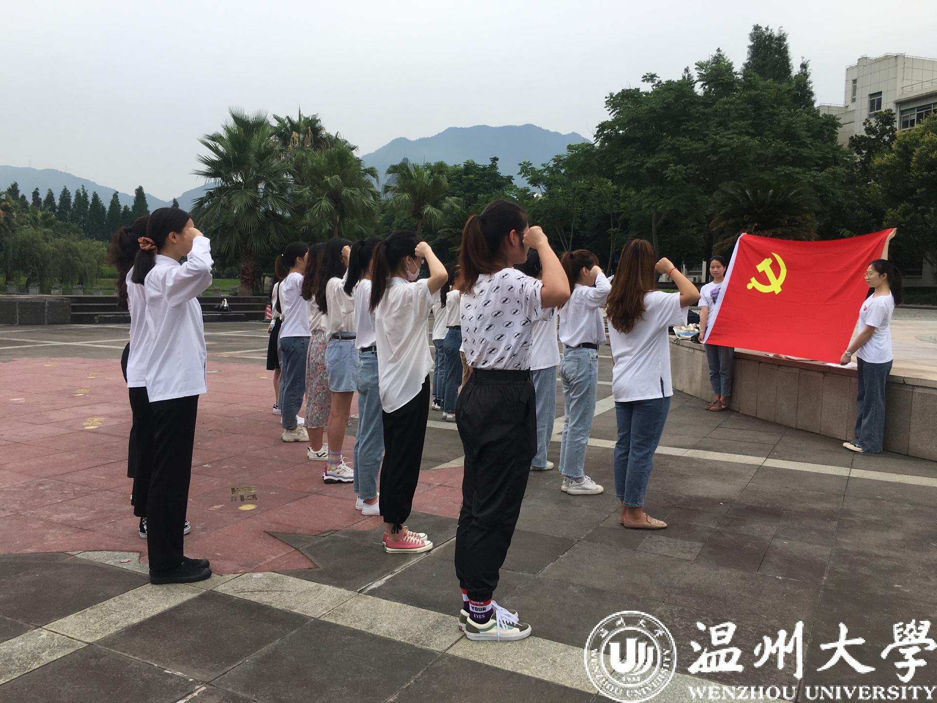 为庆祝中国共产党成立九十九周年,进一步巩固“不忘初心、牢记使命”主题教育成果,不断增强新发展党员的的党性教育,6月29日,51吃瓜 生环学院学生党支部的27名新发展党员在国旗广场通过开展“佩戴一次党徽”、“ 重温一次誓词”、“仰望一次国旗”、“书写一次祝福”、“缴纳一次党费”等活动庆祝建党九十九周年。