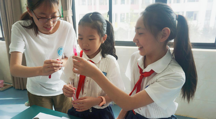7月10日至16日,实践队员们分为两组,分别前往温大附茶小及海城中学进行化学教学活动,为小朋友们带来了异彩纷呈的化学实验课程,在“香薰蜡烛制作”“银镜反应”及“自制酸碱指示剂”等科教实验中,孩子们不仅学习到了基础的化学知识,也体味到了小组团结合作的重要性。