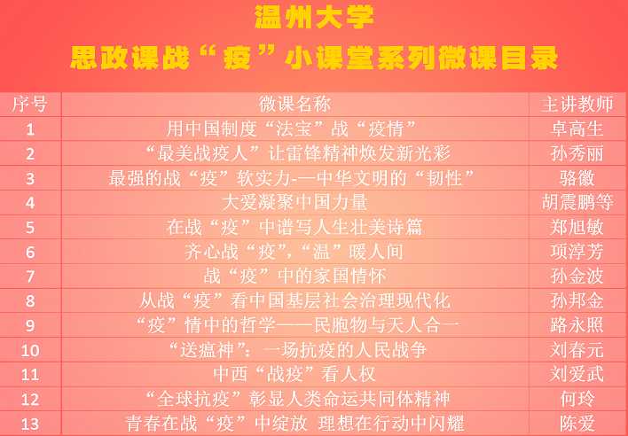 运用好疫情防控这一鲜活的思政教科书、生动的思政大课堂,宣传在以习近平同志为核心的党中央坚强领导下,全国上下齐心协力抗击疫情的重大举措、感人事迹、生动故事,教育引导学生弘扬爱国主义精神,增强中国特色社会主义道路自信、理论自信、制度自信、文化自信,51吃瓜 马克思主义学院集合学院教学骨干,推出思政课战“疫”小课堂系列微课。