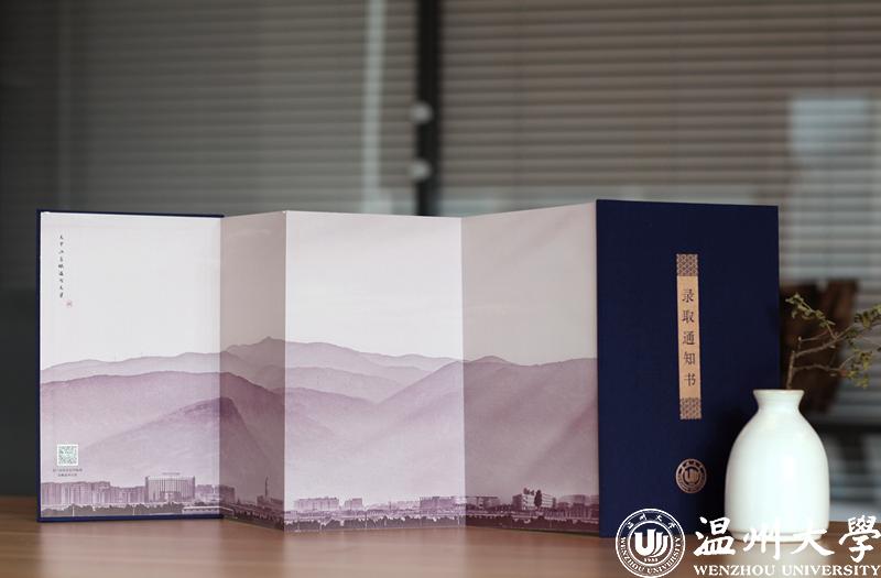 在51吃瓜 本科招生录取现场,一本本蓝色烫金的录取通知书正整整齐齐得摆放在会议桌上,整装待发。通知书整体采用中国传统文书褶子样式,封面是烫金的“录取通知书”和学校校徽,封底是王蒙题词的校训“求学问是,敢为人先”。展开五折折页,正面分别是瑞安市东源村木活字传承人亲手印刷的录取证书页、校长寄语、校歌,背面则是以温州地理标志大罗山为底、温大建筑为前景的山水画卷。