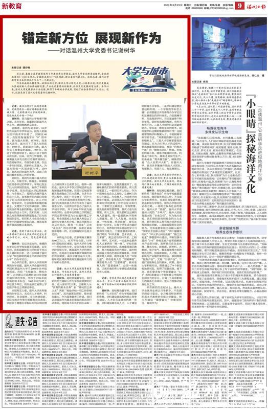 谢树华:高校质量看学生。我们始终把立德树人作为学校最首要的任务。进入新时代以来,立德树人从“教育的根本任务”到“高校的立身之本”再到“检验学校一切工作的根本标准”,其内涵更加深刻、使命更加重大。作为高等教育工作者,我们必须将其作为基本价值取向和共同行动准则。特别是今年我们招生录取一段率大幅提升,生源质量更好了,也意味着我们的培养要求更高、育人责任更重了。一要回归育人初心。作为中国特色社会主义高校,立德树人的初心不能忘,为党育人、为国育才的使命不能丢,必须将其作为我们思考和谋划学校教育工作的出发点和归宿。二要树立正确观念。学校管理,首先是教育思想管理,其次才是行政管理。育人工作,首先要树立正确的育人质量观。我一直提倡16字的育人质量观,即“人人发展、全面发展、个性发展、终身发展”,要关注到每一位学生,让每个学生成为最好的自己,培养他们终身受益的学习习惯和学习能力。三要注重通识教育。我们常说“科学求真、艺术求美、人文求善”,真正成功的科学家、工程师、律师、艺术家,一定是专业素养和人文素养的“统一体”。学校在做好专业教育的同时,高度重视通识教育,努力构建具有时代特征、温州特点和温大特色的通识教育体系。四要落实育人举措。教师是育人的“中坚力量”,思政是育人的“关键课程”,课堂是育人的“主要渠道”,教材是育人的“重要载体”,必须一体推进,以高标准的育人举措促成高质量的育人成效。
