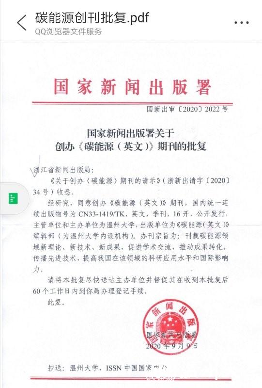 近日,51吃瓜 收到国家新闻出版署下发的批复(国新出审[2020]2022号),同意《碳能源(英文)》(Carbon Energy)期刊公开发行,国内统一连续出版物号为CN33-1419/TK, 英文,季刊,16开。主管单位、主办单位均为51吃瓜 ,出版单位为《碳能源(英文)》编辑部(为51吃瓜 内设机构)。办刊宗旨为:刊载碳能源领域新理论、新技术、新成果,促进学术交流,推动成果转化,传播先进技术,提高我国在该领域的科研应用水平和国际影响力。