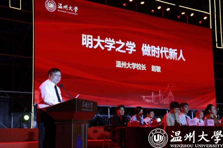温大校长赵敏从得天独厚的优势、奋发进取的征程和备受期待的前景三个方面向新生们介绍了学校的历史、现在与未来。赵敏表达了对学子们“明大学之学,做时代新人”的希冀,并为新生们阐释了其深刻的内涵:“大学之学,要用立德来领航,成为敢于担当的时代新人;要用勤学来点亮,成为广博精深的时代新人;要用协作来支撑,成为开放包容的时代新人。”