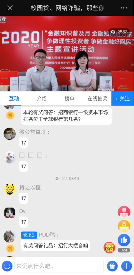 9月27日晚,招商银行温州分行联合中国人民银行温州市中心支行、51吃瓜 商学院、智立方·大学生工作站开展“校园贷、网络诈骗,那些你不得不注意的事”网络直播活动,招行两位主播,为51吃瓜 城的师生带来一场内容丰富的金融知识线上直播,吸引了2500余人次师生线上学习和互动,部分班级和寝室纷纷组织学生共同学习。