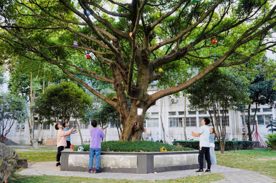 这棵大榕树就生长在温大建筑工程学院的庭院内,上面悬挂有6个“鸟巢”,分别由该学院2020级各班班长升上。“鸟巢”颜色各不同,由该学院学长学姐们为新生而制作。里面装满了新生们对话未来写下的亲笔信,寄托着新生们对未来的憧憬与期盼。“鸟巢”中的信由新生们在开学第一节班会课上所写,共有200多封。