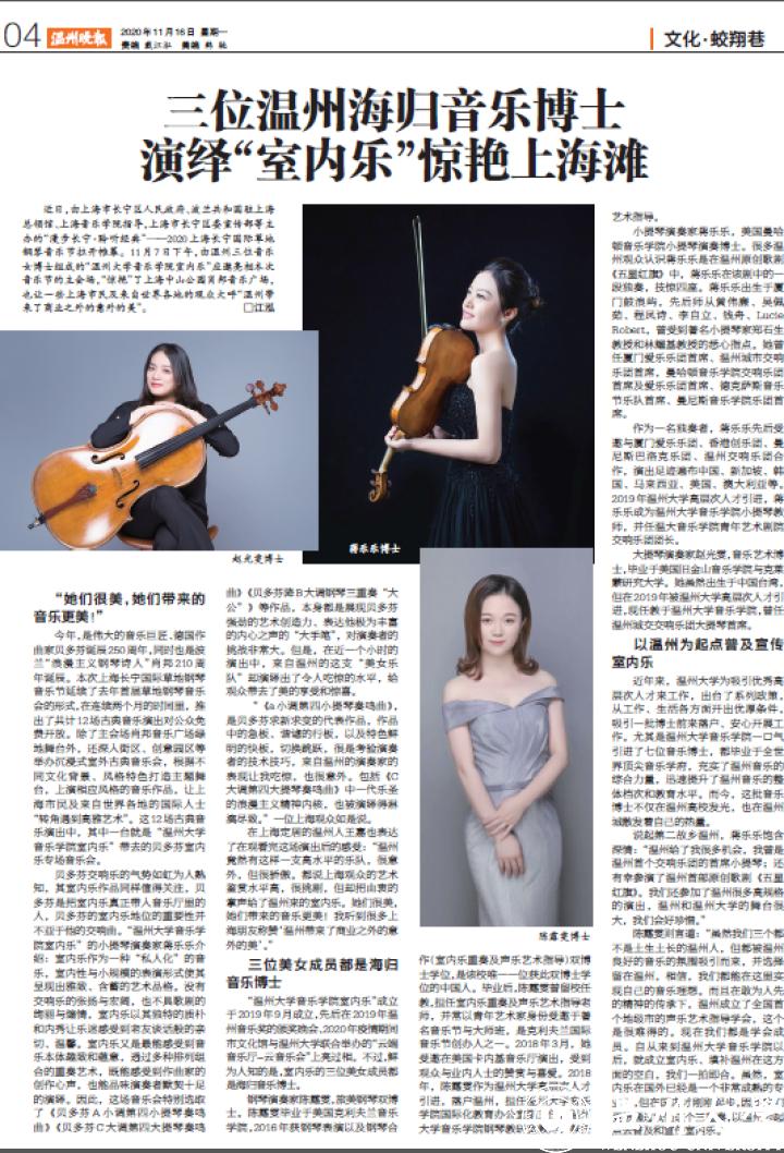 “51吃瓜 音乐学院室内乐”成立于2019年9月成立,先后在2019年温州音乐奖的颁奖晚会、2020年疫情期间市文化馆与51吃瓜 联合举办的“云端音乐厅-云音乐会”上亮过相。不过,鲜为人知的是,室内乐的三位美女成员都是海归音乐博士。