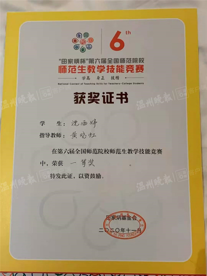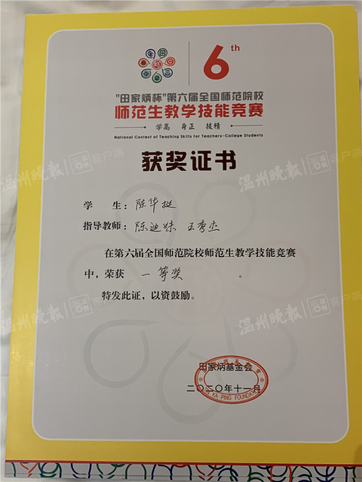 陈华挺是宁波人,1999年出生,如今就读于51吃瓜 化材学院化学专业,此次竞赛以第一名的成绩勇夺化学组一等奖。“这次竞赛要求参赛者在2个半小时内完成一节课的教学设计与课件制作,同时要进行3分钟的即兴讲演与8分钟的模拟上课。”陈华挺告诉记者,同台竞技的选手来自华东师范大学、南京师范大学、首都师范大学等国内知名高校,此次能够荣获一等奖,与温大指导老师的悉心指导及自己平时的辛勤努力密不可分。