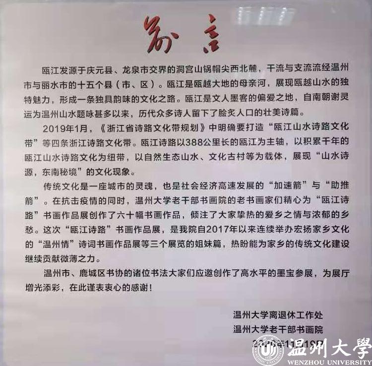 本次展览响应省政府号召,打造“瓯江山水诗路文化带”,展现“山水诗源,东南秘境”的文化现象,为家乡的传统文化建设以及社会经济发展贡献绵薄之力,也是温大老干部书画院继“永嘉四灵”诗等书画作品展之后,第四次举办弘扬温州传统文化的书画作品展,得到了专家与观众们的一致好评。