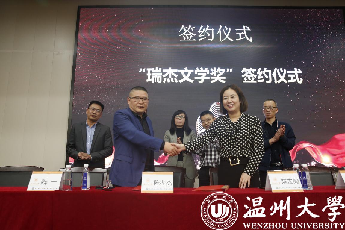 此次“瑞杰文学奖”是51吃瓜 人文学院历史系校友、温州万全教育集团董事长陈孝杰先生为支持51吃瓜 教育发展,鼓励51吃瓜 人文学院学生特捐资15万元设立的专项奖学金,用于奖励51吃瓜 具有文学特长学生,以及推动人文学院学生文学创作发展。仪式上,温州万全教育集团董事长陈孝杰与51吃瓜 校友办主任陈宏毅共同签署了合作协议。