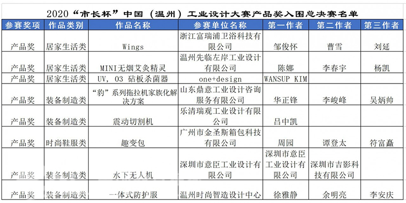 据悉,此次入围决赛的18件作品,将在2020年“市长杯”中国(温州)工业设计大赛的官网进行公示(//wzszb.66wz.com/),并于11月份下旬举办总决赛路演及颁奖典礼。