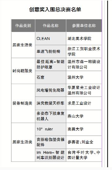 清华大学美术学院教授、副院长赵超,日用之道(北京)科技有限公司总经理高一强,浙江工业设计协会秘书长章群星等评审专家认为,当前的产品类设计作品中,多是对当前工业制造加以技术改造、升级,尚缺些超前变革与创新。今后期待有更多的技术、材料运用上,能够引领产业从传统制造业向服务型制造、数字化制造转型的颠覆性创意作品出现。