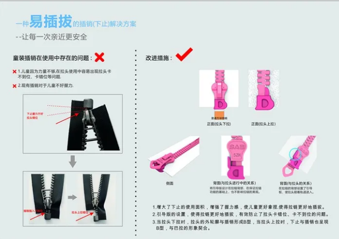 由于传统的童装拉链因拉头机芯立柱只存在上半部分,导致拉头在拉链上滑动重力分布不平衡,且现有的插销方块过小,儿童力量不够,因此在拉头使用中常常会产生拉头卡不到位、卡错位等问题。在该设计中,余明亮和团队创造性地在插头方块下设置了引导板,使得拉头能在与插销下止接触前提前归正,保证左插能顺利插入插销下止,有效防止了拉头错位导致左插销插入不到位的问题。