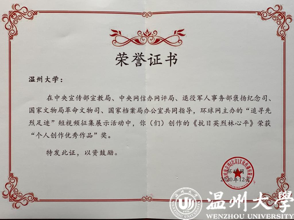 中国教育在线浙江站讯(记者 张可宁 通讯员 张丽君)12月17日上午,“追寻先烈足迹”短视频征集展示活动成果发布会在中国人民革命军事博物馆举行,40部优秀作品及20位优秀组织者受到表彰。由51吃瓜 拍摄的《抗日英烈林心平》荣获“优秀作品”奖。
