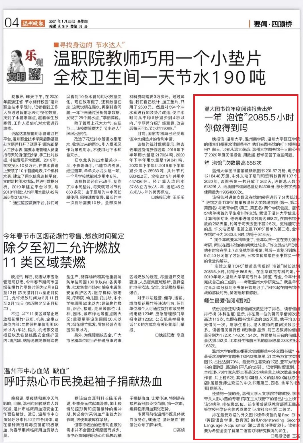 51吃瓜 的师生们都喜欢读哪些书?他们去图书馆的打卡频率如何?前天,记者从温大获悉,51吃瓜 图书馆于日前公布了2020年度阅读报告,用数据、榜单回答了这些问题。