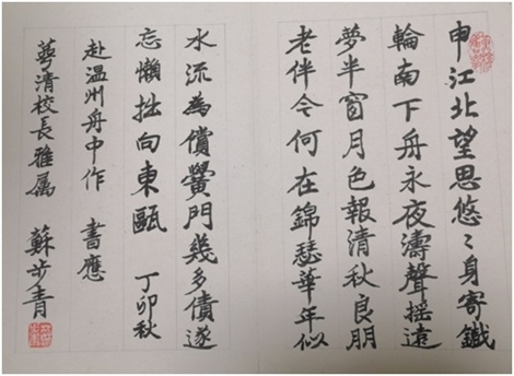 陈兴桂介绍,在老校长贡献的苏老墨宝中,其中一幅是册页书法作品,是1987年秋天苏老从上海乘坐轮船赴温州时,在船上酝酿所作的一首诗,诗里这样写道:“申江北望思悠悠,身寄铁轮南下舟。永夜涛声摇远梦,半窗月色报清秋。良朋老伴今何在,锦瑟年华似水流。为偿黉门几多债,遂忘懒拙向东瓯。”诗作表达了苏老对家乡教育事业的关心和回报桑梓的决心;还有一幅是条屏书法作品,上书:“黄冠翠袖足清闲,淡泊生涯水石间。南闽有家归梦远,西湖无庙属杯难。闻香晓日春何早,听雨青灯夜更寒。我似老僧偏爱静,案头不厌两相看。”这是苏老专门为魏校长题写的诗词书法作品,见证了两人在创建原51吃瓜 的过程中结下的深厚友谊,她也对苏老给予极高评价,认为苏老对51吃瓜 贡献卓著。在原温大筹建之初,办学条件非常艰难,资金和场地都极其有限,苏老对此不仅不介意,反而勉励大家要立志办好大学。苏老曾说:“人家说我们51吃瓜 是叫化子大学,那我就是叫化子头头。为人民培养人才,需要我讨饭,我就去讨饭,有什么关系啊!我死都不怕,还怕讨饭?”他还勉励大家,用30年时间把51吃瓜 办成国内同类高校中的一流大学,凸显了他作为教育家的长远目光。