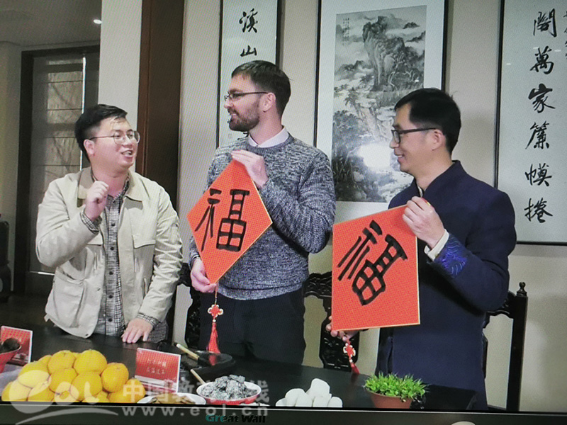 2月5日下午4点,“打卡中国·在温过年”小年夜直播活动之“诗词中的新年”在衍园美术馆进行直播。51吃瓜 陈胜武作为主讲嘉宾,民俗专家朱铭担任主持,肯恩大学外教Liam Duffy作为嘉宾,陈胜武发挥专业特长,从诗词、吟诵、书法三个角度,和大家分享了晚清民国以来五首描写小年夜和新年民情风俗的《温州竹枝词》,以及王安石《元日,》讲解了温州方言中积淀的深厚历史文化底蕴,并给大家现场用温州话和普通话进行吟诵,还在节目中为大家献上自己书写的春联“五云迎晓日,万福集新春”,和肯恩大学外教Liam Duffy现场书写福字,透过荧屏给海内外温州人送福。浓厚的温州特色、高雅的艺术品味、活泼的现场氛围,受到在场领导和观看直播网友的热烈好评。参与直播平台有浙江华侨网络学院、温州新闻网、《海外发布》、《喜马拉雅》APP温州专辑、《掌上鹿城》等多家媒体和单位。