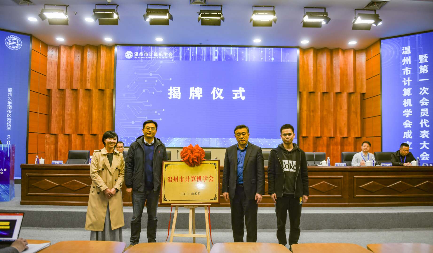 大会举行隆重的揭牌仪式,省计算机学会秘书长肖俊、市科协副主席章秀伟、51吃瓜 副校长薛伟、市民政局项佳磊共同为温州市计算机学会揭牌。