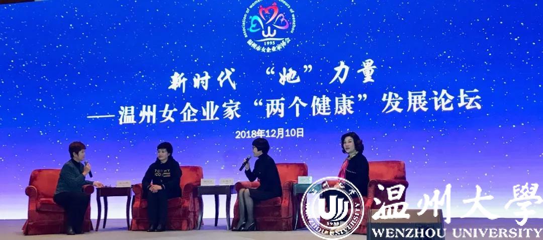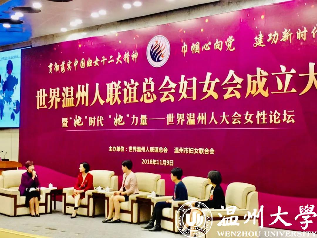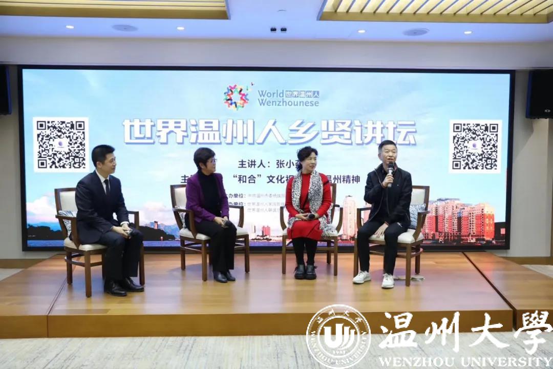 △张小燕主讲“世界温州人乡贤论坛”,邀请几位朋友做嘉宾(右一作家李涛 右二为十九大代表宋玲华、右四是主持人翁逻沿)