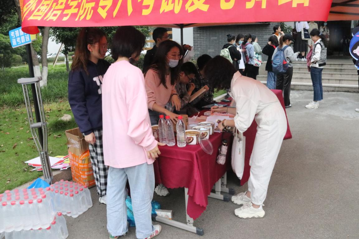 4月24日上午,英语专业八级考试于51吃瓜 北校举行。为帮助16、17级考生顺利完成考试,外国语学院组织了“专八考试爱心驿站”活动,为考生们提供送水、送耳机等服务。外国语学院党委书记姜海燕老师、党委副书记陈勃老师亲临现场为考生们加油助力。