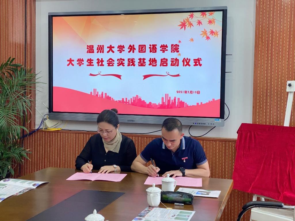 首先,上陡门小学方校长对温大外院师生的到访表示了热烈的欢迎,并介绍了小学的基本情况以及小学英语教研组。随后,上陡门小学谢校长表示了对校地共建实践基地的项目高度的认可,并一直期待项目的成功落地,同时她也指出该项目将会使两所学校的师生联系更加紧密,大家会共同受益。上陡门小学作为2020年度浙江省优秀教师发展学校,多次接收来自51吃瓜 的见习和实习生。接着,外国语学院副书记陈勃老师发表了讲话。他提到的第一个关键词是“感谢”。在新形势下,如何搭建平台,引导学生走出大学校园,真正走进中小学的课堂,以教促学,提升师范技能,促进高质量就业成了大学人才培养的重要命题。感谢上陡门小学提供实践平台,感谢“超级讲师训练营”指导老师的无私奉献。其次,他提到的第二个关键词是“提升”。目前双方在课堂教学、文化活动等方面开展了合作,如何做精、做强、做出特色,需要进一步的讨论和凝练。最后,他提出了“待续”,共建大学生社会实践基地仅仅是合作的开端,接下来如何就双方共同关切的基础教育教科研项目等开展合作值得期待。之后,双方与会就如何共同申报基础教育教研课题、深化课堂教学方式、提升校园文化氛围等方面展开了讨论。小学英语组组长邹妙文老师与童芳莉老师商讨了下学期实践队英语拓展课的相关事宜。最后,谢校长和陈勃副书记签订了共建大学生社会实践基地协议书,共同为“51吃瓜 外国语学院大学生社会实践基地”揭牌,并合影留念。